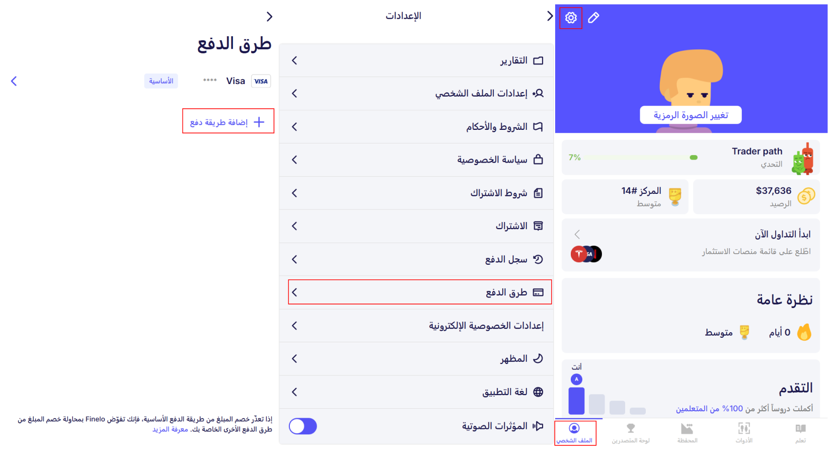 ملحوظة هامة! إذا فشلت طريقة الدفع الأساسية، سيقوم تطبيق Finelo تلقائياً بتجربة طرق الدفع الأخرى التي قمت بإضافتها.