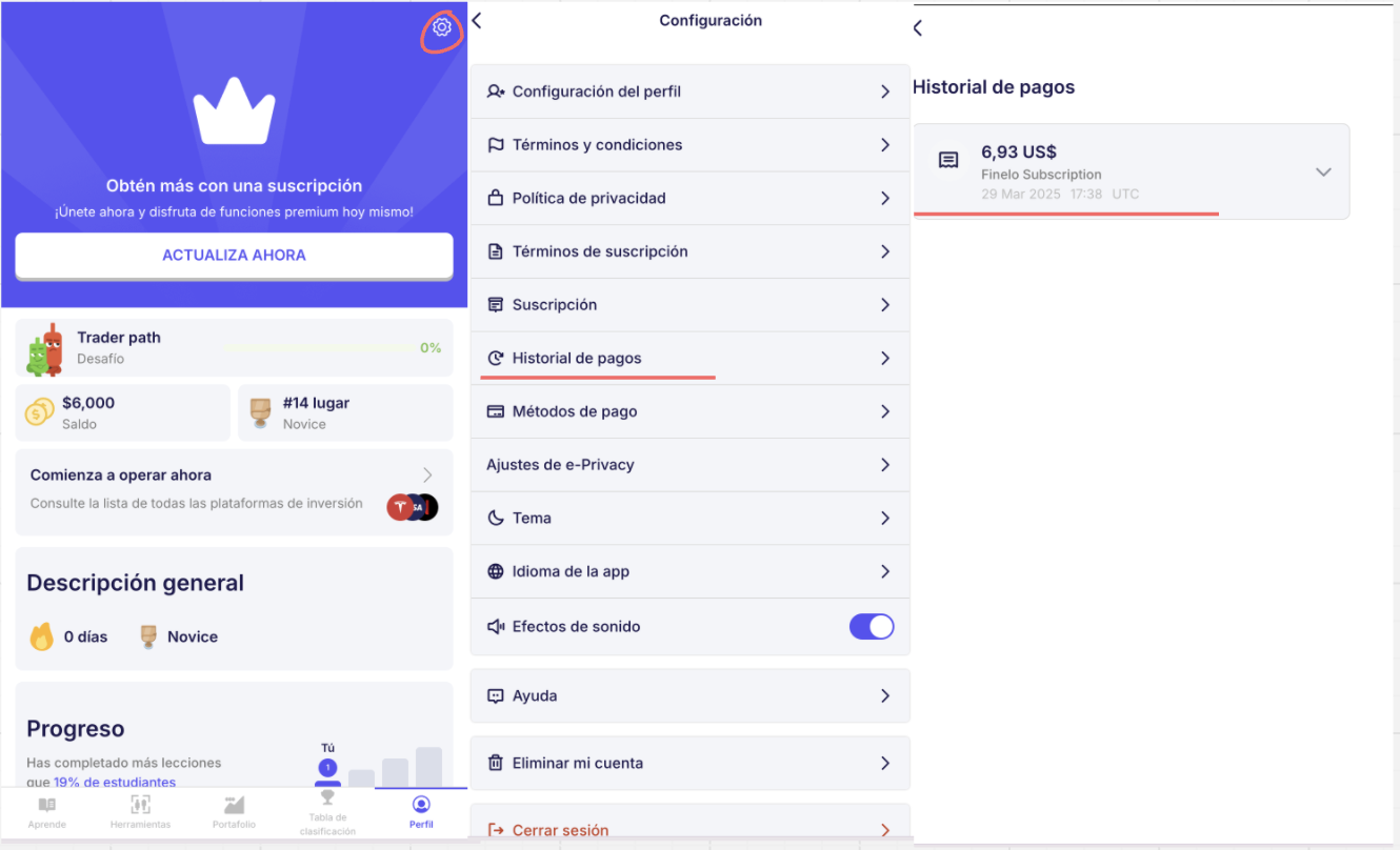 Si no puedes descargar la factura dentro de la aplicación, ponte en contacto con nosotros en support@finelo.com y solicita una copia de tu factura de pago.