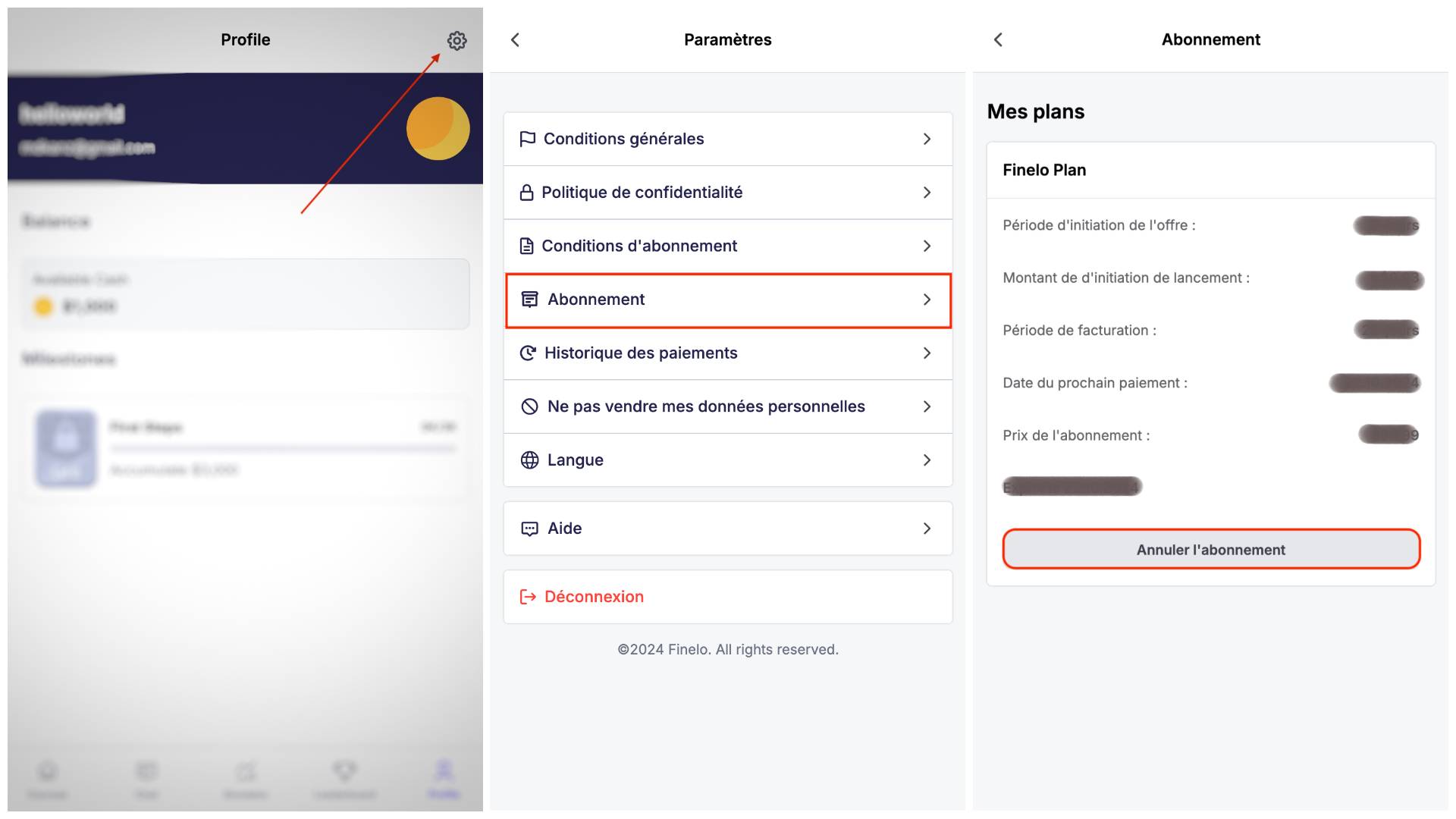 Remarque : Si vous vous êtes abonné via notre site web, puis avez téléchargé l'application depuis l'App Store, suivez les mêmes instructions : Profil Finelo → Paramètres → Abonnement → Annuler l'abonnement.