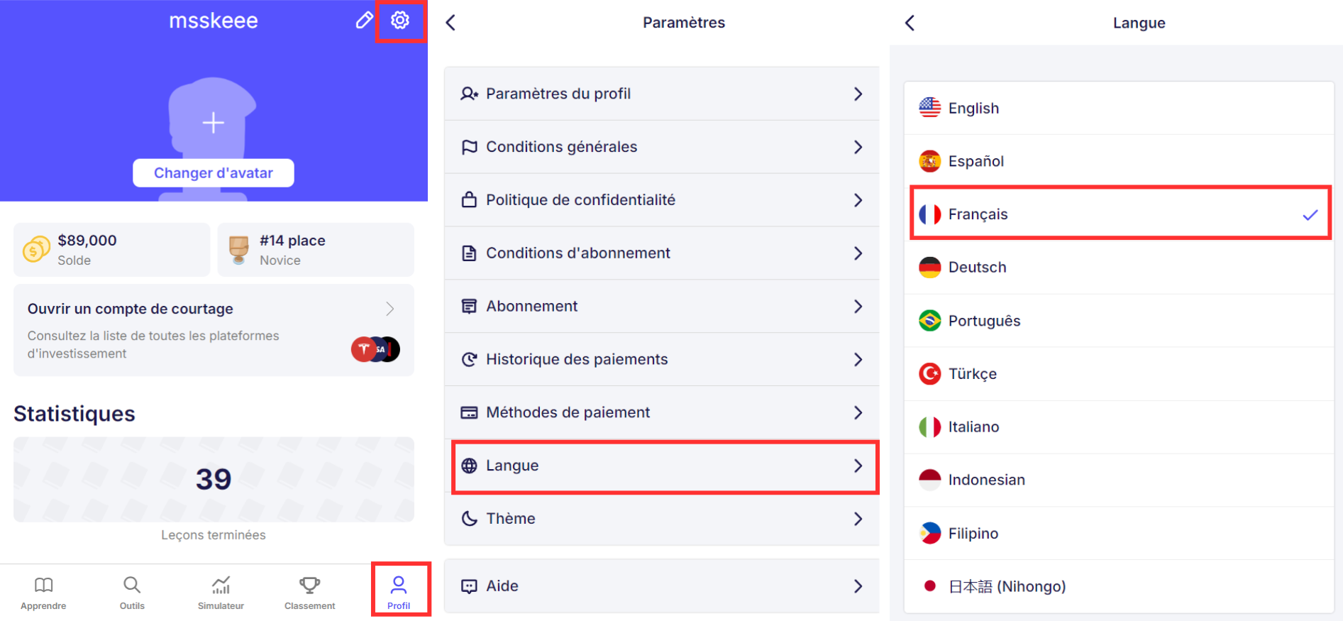 Pour modifier la langue de l'interface de l'application, suivez ces étapes :