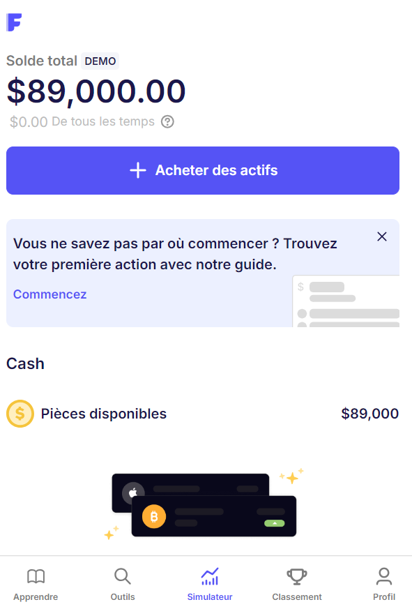 Le Simulateur de Finelo est un outil qui vous permet de vous entraîner à investir et à trader avec de l'argent virtuel, sans risque ! Il est idéal pour les débutants qui souhaitent explorer les marchés financiers, notamment les actions et les cryptomonnaies, sans craindre de perdre de l'argent réel.